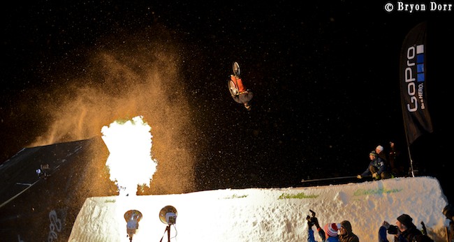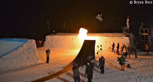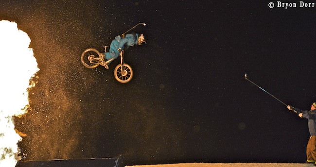 Great shot Matt Trappe took of me helping this kid fix his tacoed rim during the big air Mtn Bike finals. He got it to spin again, but the speed wobble was crazy!