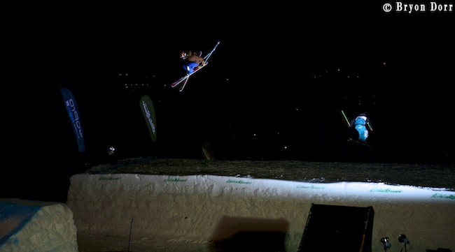 Showing off for the crowd with lots of skiers hitting the ramp blue angle syle.